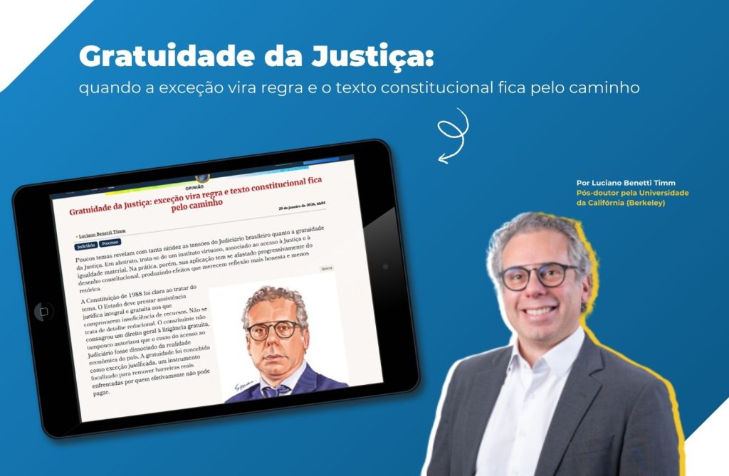 Em artigo publicado no portal Conjur (Consultor Jurídico), o jurista Luciano Benetti Timm alerta que a gratuidade da Justiça, prevista na Constituição de 1988 como benefício destinado a quem realmente não pode arcar com os custos processuais, tem se transformado, na prática, em regra geral.