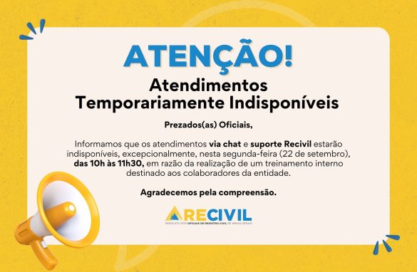 Interrupção necessária para capacitação interna da equipe Prezados(as) Oficiais, Informamos que, excepcionalmente, nesta segunda-feira, 22 de setembro, os atendimentos via chat e suporte do RECIVIL estarão indisponíveis das 10h às 11h30, em virtude da realização de um treinamento interno voltado à qualificação dos colaboradores...