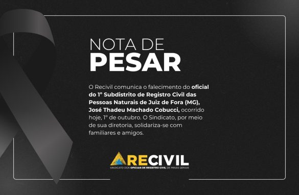 Com pesar, comunicamos o falecimento do oficial do 1º Subdistrito de Registro Civil das Pessoas Naturais de Juiz de Fora (MG), José Thadeu Machado Cobucci, ocorrido em 1º de outubro. O Recivil, por meio de sua diretoria, manifesta solidariedade aos familiares e amigos neste momento...