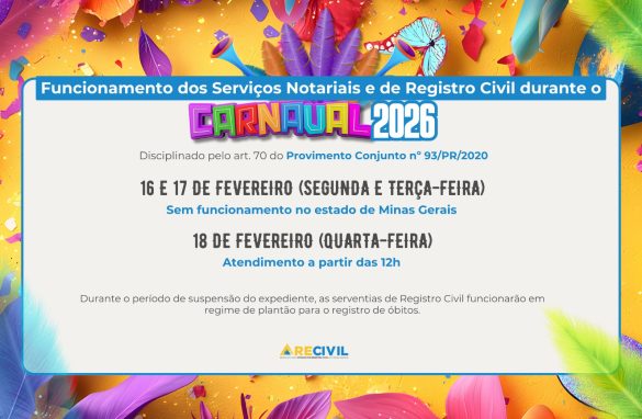 Conforme estabelece o art. 70 do Provimento Conjunto nº 93/PR/2020, os Cartórios de Notas e de Registro Civil do Estado de Minas Gerais terão horários de funcionamento alterados na próxima semana devido ao feriado de Carnaval, nos dias 16 e 17 de fevereiro. É fundamental...