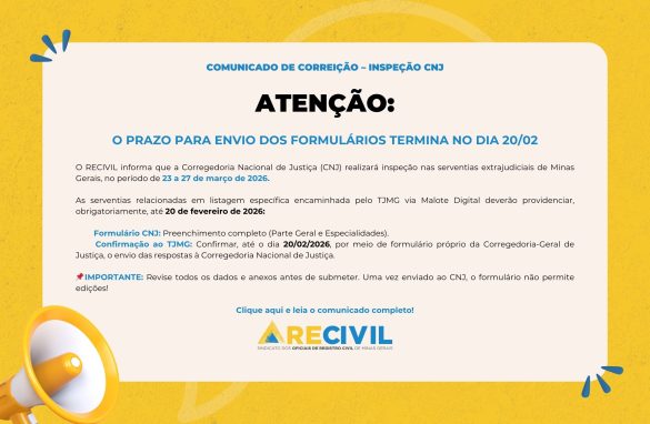 COMUNICADO O RECIVIL informa que a Corregedoria Nacional de Justiça (CNJ) realizará inspeção para avaliar as serventias extrajudiciais do Estado de Minas Gerais, no período de 23 a 27 de março de 2026. Em razão disso, as serventias relacionadas em listagem específica encaminhada pelo...