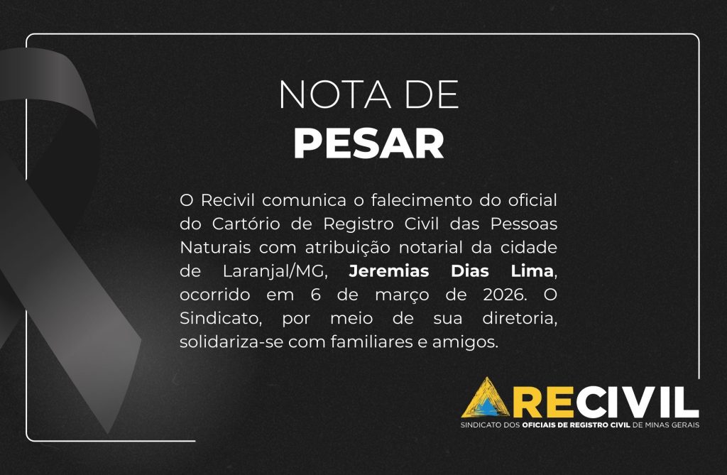 O Recivil comunica o falecimento do oficial do Cartório de Registro Civil das Pessoas Naturais com atribuição notarial de Laranjal/MG, Jeremias Dias Lima, ocorrido em 6 de março de 2026. A diretoria do Sindicato manifesta solidariedade aos familiares e amigos.