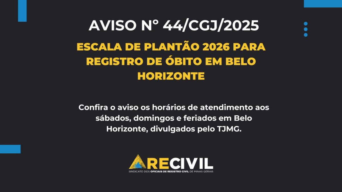 AVISO Nº 44/CGJ/2025 Avisa sobre a escala de plantão bimestral, a vigorar no ano de 2026, para os registros de óbito que ocorrerem em Belo Horizonte, aos sábados, domingos e feriados, no horário das 9h às 12h e das 13h às 17h. O CORREGEDOR-GERAL DE…