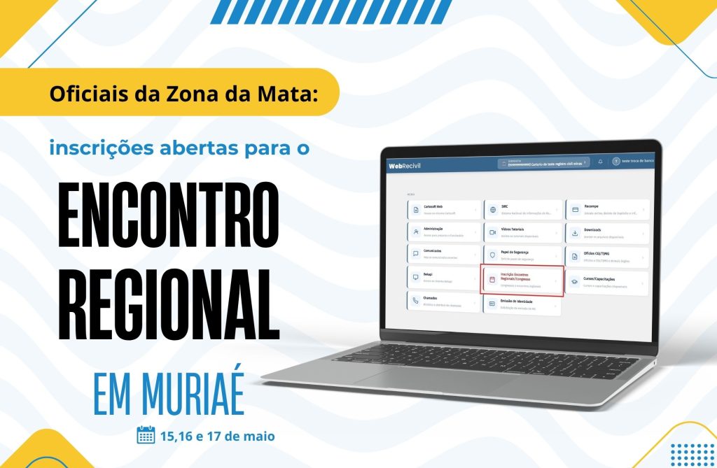 Estão abertas as inscrições para o Encontro Regional do Recivil em Muriaé, que será realizado nos dias 15,16 e 17 de maio, no Hotel Gran Premium Plaza, localizado na Avenida Constantino Pinto, 180. A iniciativa é voltada aos oficiais de registro civil da Zona da Mata e reforça o compromisso com o fortalecimento das serventias na região.