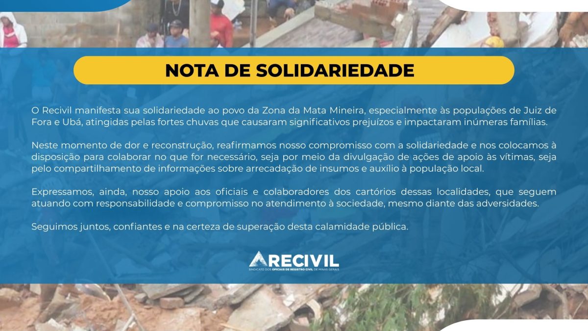 Diante da tragédia que assola a Zona da Mata mineira, o Recivil (Sindicato dos Oficiais de Registro Civil das Pessoas Naturais do Estado de Minas Gerais) mobilizou seu setor de assistência social para uma força-tarefa de emissão emergencial de documentação básica em Juiz de Fora….