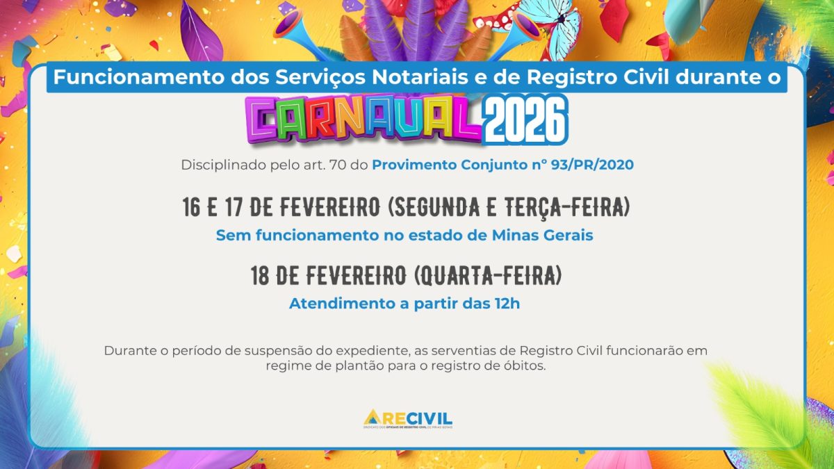 Conforme estabelece o art. 70 do Provimento Conjunto nº 93/PR/2020, os Cartórios de Notas e de Registro Civil do Estado de Minas Gerais terão horários de funcionamento alterados na próxima semana devido ao feriado de Carnaval, nos dias 16 e 17 de fevereiro. É fundamental…