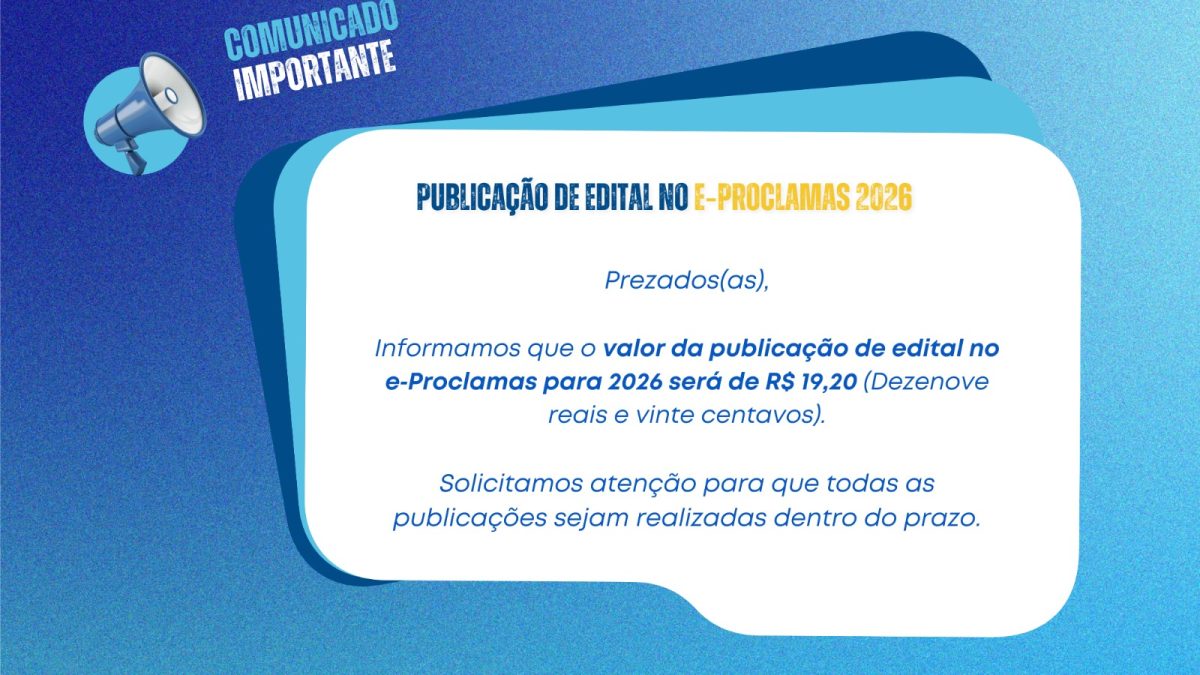 Informamos que o valor da publicação de edital no e‑Proclamas para 2026 será de R$ 19,20, conforme tabela de emolumentos vigente. Solicitamos atenção para que todas as publicações sejam realizadas dentro do prazo.