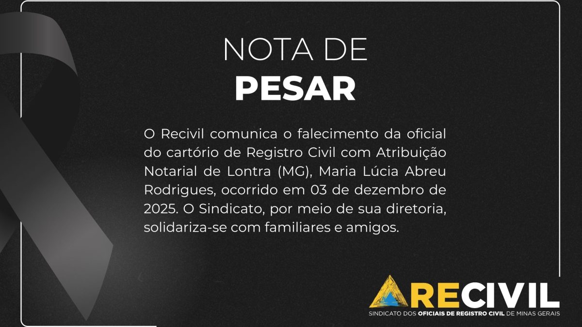 O Recivil comunica, com pesar, o falecimento da oficial do Cartório de Registro Civil com atribuição Notarial de Lontra (MG), Maria Lúcia Abreu Rodrigues, ocorrido no em 3 de dezembro de 2025. O Sindicato, por meio de sua diretoria, solidariza-se com familiares e amigos.