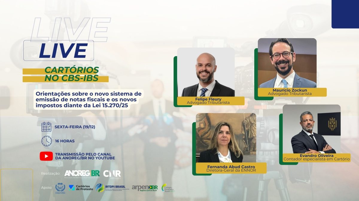 A Anoreg/BR e o Colégio Notarial do Brasil (CNR) promovem, nesta sexta-feira, 19 de dezembro, às 16h, a live “Cartórios do CBS – IBS”, que abordará orientações sobre o novo sistema de emissão de notas fiscais e os novos impostos previstos na Lei nº 15.270/2025….