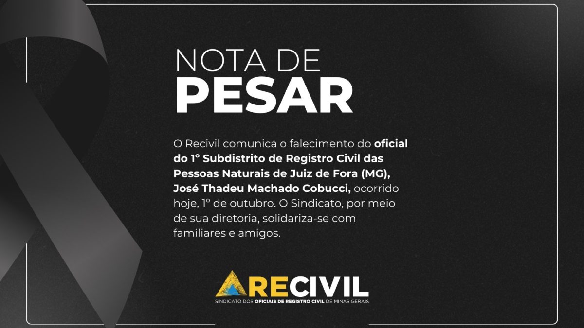 Com pesar, comunicamos o falecimento do oficial do 1º Subdistrito de Registro Civil das Pessoas Naturais de Juiz de Fora (MG), José Thadeu Machado Cobucci, ocorrido em 1º de outubro. O Recivil, por meio de sua diretoria, manifesta solidariedade aos familiares e amigos neste momento…