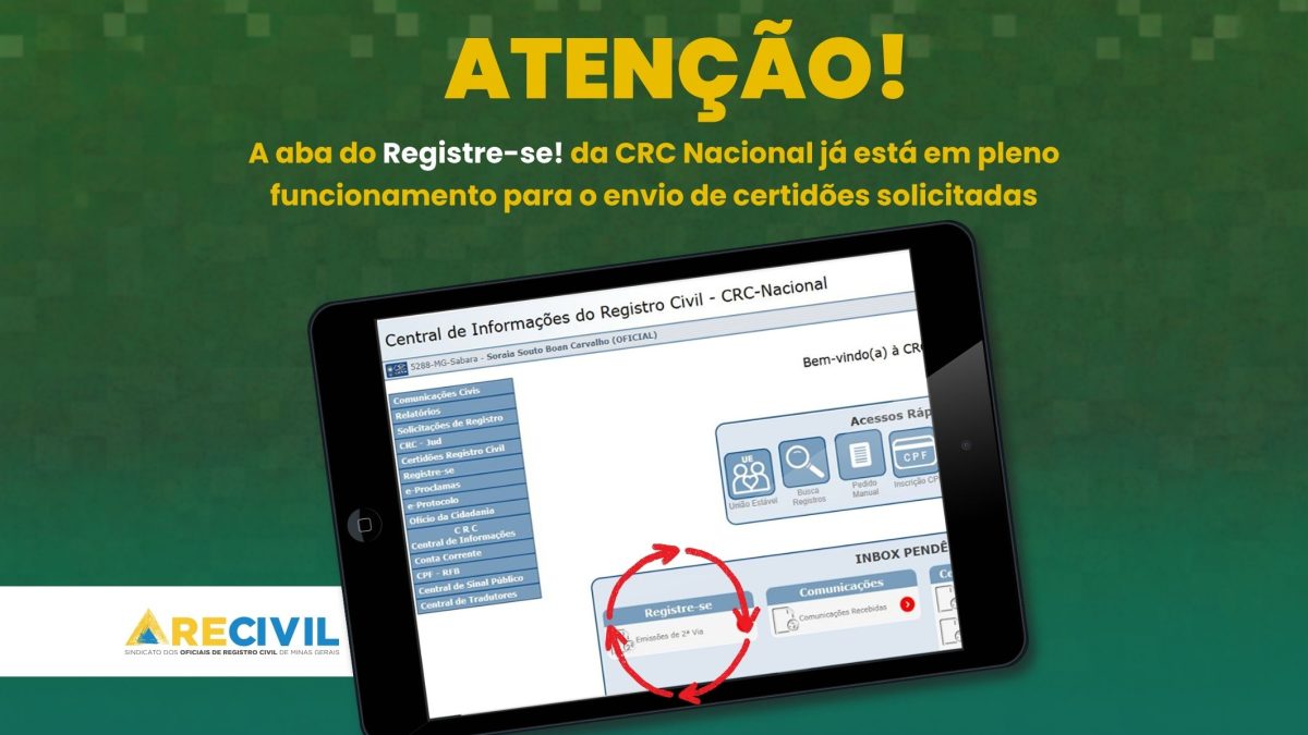 Para o envio das certidões solicitadas, é fundamental ficar atento: a aba Registre-se da CRC Nacional já está disponível e em pleno funcionamento. Utilize corretamente essa funcionalidade para garantir mais agilidade e eficiência nos atendimentos.