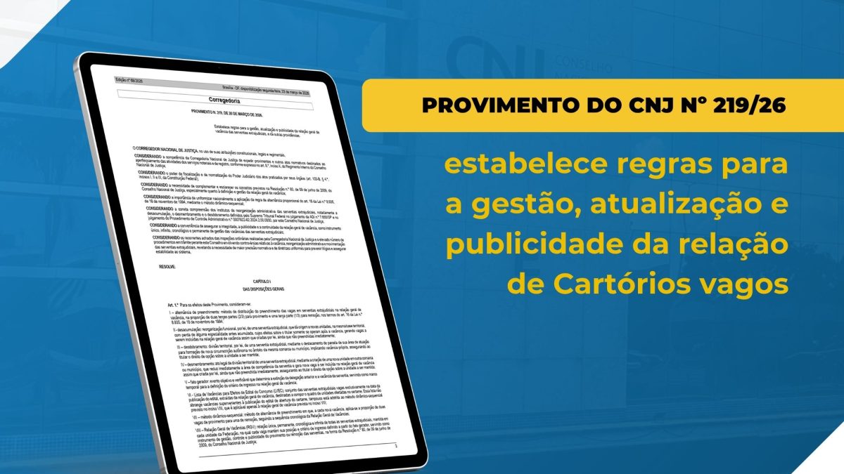 O Conselho Nacional de Justiça (CNJ) publicou, em 20 de março de 2026, o Provimento nº 219, que estabelece regras para a gestão, atualização e publicidade das vacâncias das serventias extrajudiciais em todo o País. A medida visa trazer transparência, organização e uniformidade na administração…